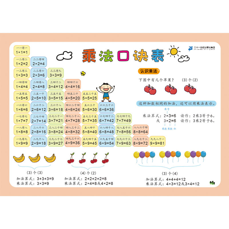《小学生速记表》,升级版的儿童学习用表,根据统编版小学教材重新梳理编写,配备更贴近课本知识点的图例解释,内容涵盖小学语文、数学、英语等基础学科,是一套适合小学生学习的便捷工具书。已经出版的8册分别是《汉语拼音表》《汉字偏旁·笔顺表》《识字》《常用多音字》《认识数字》《加减法口算表》《乘法口诀表》《英语字母·英语音标表》。《乘法口诀表》是其中的一册,内容主要是包括认识乘法和1-9的乘法口诀。