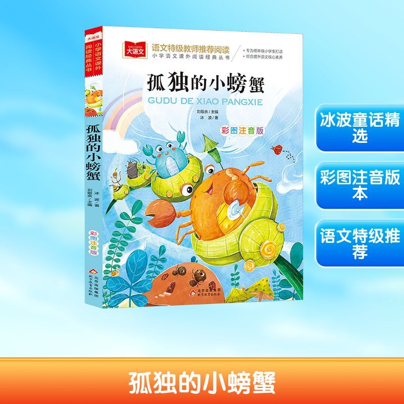 《孤独的小螃蟹》是我国著名儿童文学作家冰波的短篇童话集,包括《孤独的小螃蟹》《恐龙鲁鲁》《晚安,我的星星》等,其中《孤独的小螃蟹》讲述了既是好朋友也是邻居的小螃蟹和小青蟹,他们常常一起外出晒太阳。可是有一天,小青蟹为了寻找更好的地方而离去,小螃蟹伤心不已,十分孤独。他找不到小青蟹,就一边做事一边等待。他做了很多善事,不仅帮助了小纸鸟、狮子和小乌龟,还学会敲可乐罐鼓,为邻居们带来了欢乐。不知不觉,小螃蟹长大了,小青蟹也回来了。