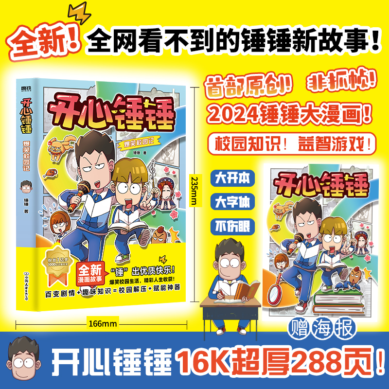 "1,1亿+粉丝关注的超级IP“开心锤锤”,是网络点击量近千亿次的现象级内容创作者,以开心锤锤为主要形象,创作的“开心锤锤”系列动画、图书作品以分享新时代青少年的成长喜悦、解析求学求职等不同阶段的困惑,传播积极观念,让每一代人都拥有童年快乐的回忆为主旨,获得了广大读者的认可和共鸣! 2,《开心锤锤爆笑校园记》,是锤锤全新原创漫画作品,非抓帧! 3,全书围绕“上副课”“妈妈的双标”“穿校服”“赶作业”等13个主题展开故事;每个故事搭配有趣的“锤锤新知识”及实用的“锤锤好方法”,在爆笑中激活孩子的自驱力,追逐优质高级的内啡肽快乐。 4,全书精制5款烧脑有趣的游戏,锻炼图形观察、逻辑推理、文字游戏等能力,快来享受头脑解压! 5,16开大开本,看得过瘾;288页百变剧情,解压!无曝光,看它!!!"