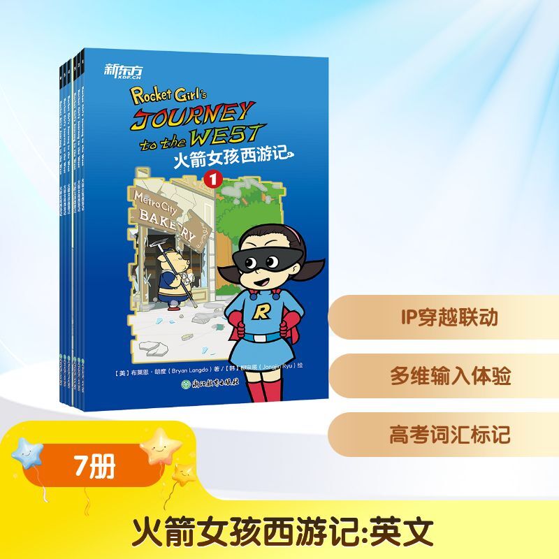 《火箭女孩西游记》全套共7册,其中包含6册故事书、1册练习册,以及6张人物闪卡。故事书的情节围绕着来自不同时代背景的火箭少女Roxy(罗西)与中国神话英雄孙悟空展开,他们意外地互相穿越到对方的世界,最后合力打败妖怪。这套书不仅采用新颖独特的故事编排,还配有丰富的线上资源:动画视频、故事音频、词汇音频和中文翻译,其中动画视频有英文字幕版和无字幕版两个版本可供选择。本书为桥梁书,适合海尼曼英语分级阅读G2~G3阶段并开始独立阅读的孩子。全书总阅读量超20,000词,词汇量超1,000,蓝思值400~600L,AR值3.2,语言难度介于《Rocket Girl火箭女孩》和《Journey to the West西游记》之间,是小学英语水平较高孩子的英文拓展读物。