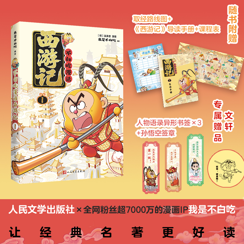 《不白吃漫话西游记1》是本系列漫画的第一册,以人民文学出版社《西游记》经典版本为蓝本,由人民文学出版社与超人气漫画IP“我是不白吃”联合策划。