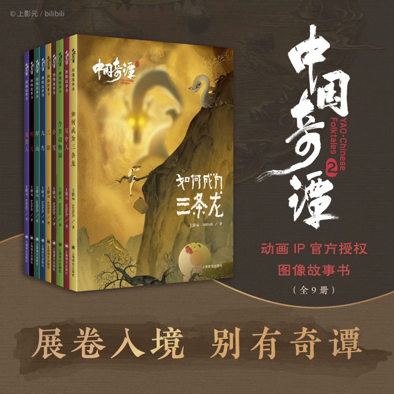 “中国奇谭2”系列图书是同名热播动画改编的图像故事书,由上影元和bilibili官方授权上海译文出版。本系列共包含九个故事:《如何成为三条龙》《耳中人》《今日动物园》《小雪》《三郎》《大鸟》《拜山》《刑天》《大贵人》。